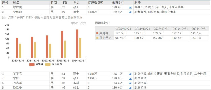 可以看出,吴建峰在今世缘工作了超三十年,为今世缘稳健发展贡献了重要力量。而吴建峰近五年薪酬分别为127.5万元、135.1万元、143.5万元、172.1万元、182.2万元,呈逐年增长趋势,五年内累计涨薪54.7万元,为8位副总经理中的最高薪酬,仅次于董事长顾祥悦,后者去年薪酬为189.0万元。
